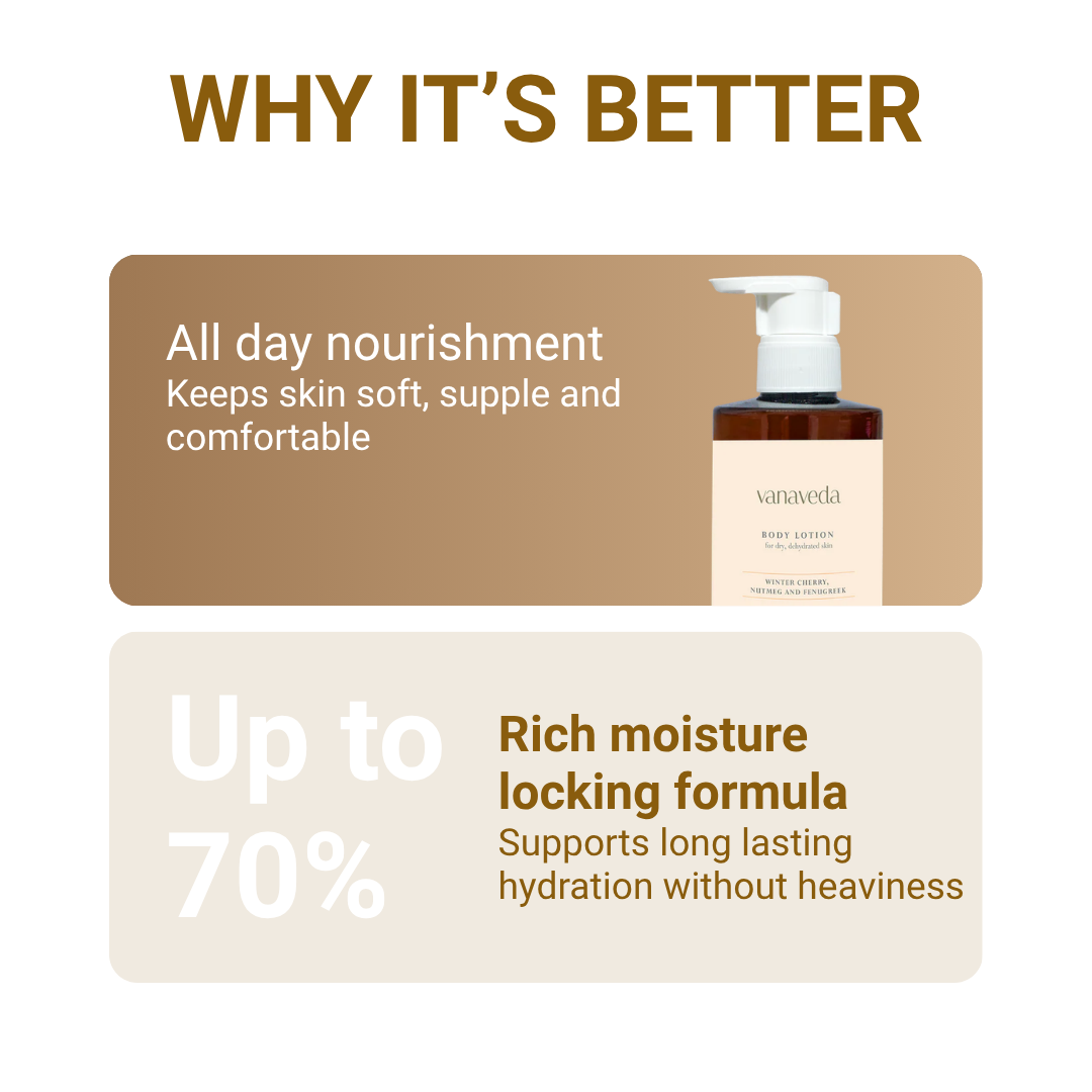 Body Lotion Vata is a rich, deeply nourishing formulation created specifically for Vata dominant skin, which commonly experiences dryness, tightness, and rough texture. The creamy texture delivers long lasting hydration while helping soften and smooth the skin surface.